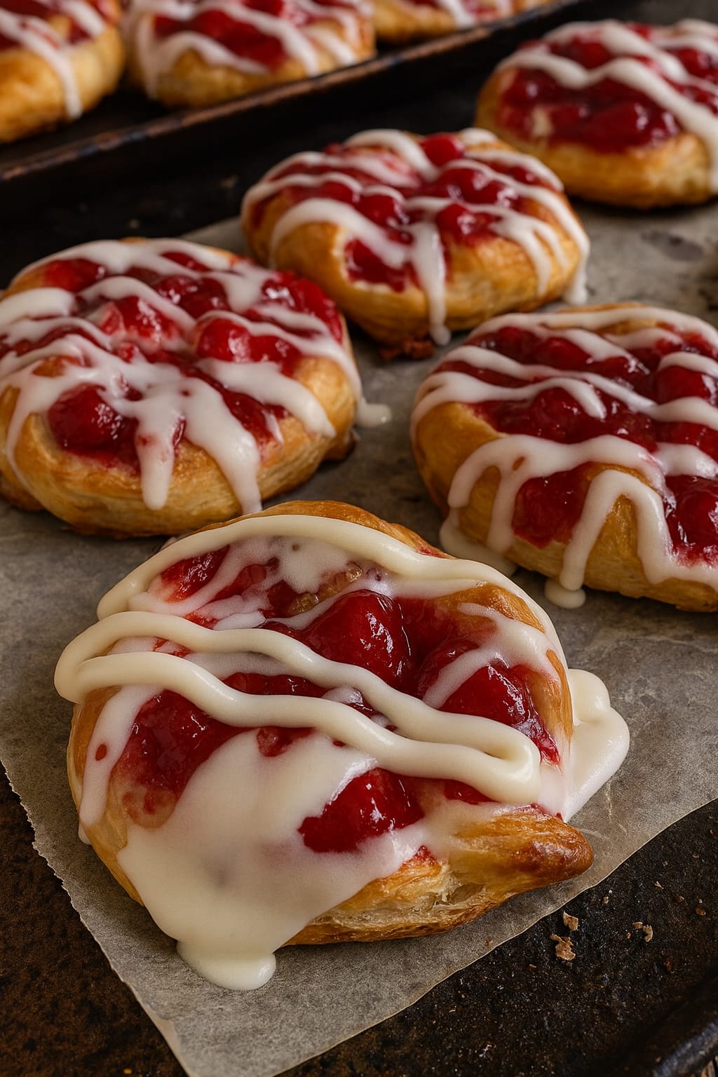 These danishes feature a flaky crescent roll base, a sweet and tangy cream cheese filling, and a bright cherry topping, finished with a simple, shiny glaze. They're irresistible!