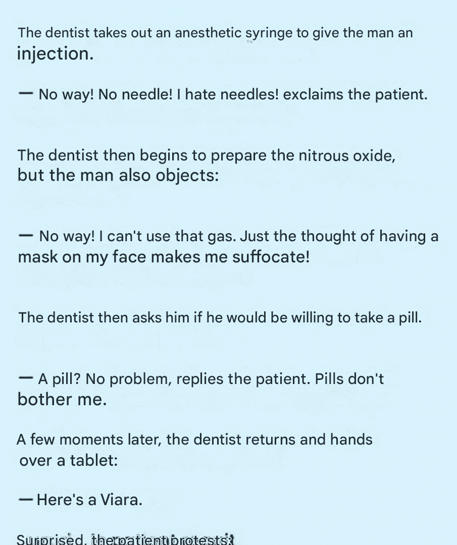 A fear of needles can sometimes lead to unpredictable, comical situations, as illustrated by the story of a patient who resisted standard sedation methods at the dentist.